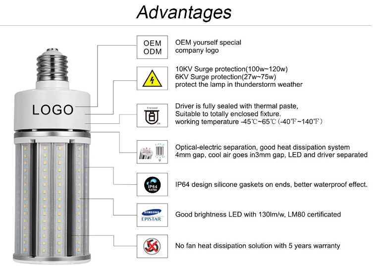 E39/E40 retrofit led corn light allow to replace inefficient traditional bulbs with highly efficient and bright LEDs. These bulbs replace CFL and HID bulbs that range between 40W to 450W. The design of these LEDs allow for 180/360 degree illumination to exactly replcate traditional bulbs in light coverage and color temperature.